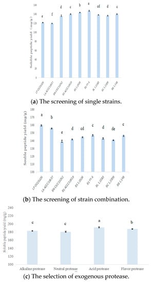 The data of screening strains and strain combinations are presented in Figure 3a,b. The soluble peptide yield of rapeseed meal fermented with B. subtilis YY-4 was higher than those of purchased strains (p < 0.05), and the combination (B. subtilis YY-4 and L. plantarum 6026) had higher peptide yield than other combinations (p < 0.05). The data of selected proteases are presented in Figure 3c, and the peptide yield of acid protease assisting the best combination increased more than those of other proteases (p < 0.05).