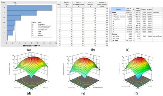 Optimization of fermentation conditions and response surface plots showing the interaction effect of variables on soluble peptide yield. (a) Pareto diagram describing the impact of factors (temperature, acid protease amount, ammonium sulfate, inoculation size, sugar, time and moisture) evaluated by a Plackett–Burman design on soluble peptide yield (mg/g); (b) Box Behnken design matrix for optimization of soluble peptide yield (mg/g); (c) analysis of variance (ANOVA) for response surface quadratic model on soluble peptide yield (mg/g); (d) interaction of moisture (%) and time©); (e) interaction of moisture (%) and acid protease amount (%); (f) interaction of acid protease amount (%) and time (h).