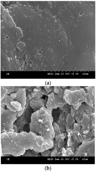 Scanning electron microscope images of the rapeseed meal (RSM) (a) and fermented rapeseed meal with acid protease (FRSMP) (b) (10 µm) at 5000× magnification. The samples were photographed with secondary electron image at a low acceleration voltage of 5.0 kV.