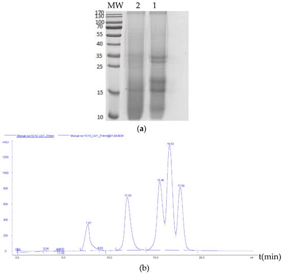 The molecular weight distributions of soluble peptides determined by SDS-PAGE of the RSM before and after fermentation are presented in Figure 6a, and the concentrations of different peptide fractions are shown in Table 2. The molecular weight was a critical variable responsible for the activity of peptides. Most rapeseed proteins with high molecular weight were degraded to small rapeseed peptides with low molecular weight after fermentation, and the molecular weights of most rapeseed proteins were degraded to below 9.5 kDa (Y = −6.3013X + 33.134, R2 = 0.9602) (SDS-PAGE).