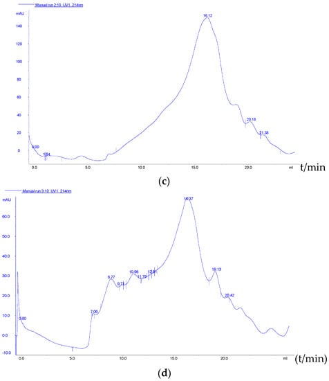 To further determine the MW distribution of small molecular peptides accurately, the gel chromatography method was employed. The calibration curve of MW relative to retention time is shown in Figure 6b, and the MW distribution of the RSM and FRSMP is shown in Figure 6c,d. The MW distribution was determined according to a calibration curve of MW relative to retention time. The small peptide concentrations of RSM obviously increased after fermentation, and the peak areas of the FRSMP with low MW were more than that of the RSM. This result suggested that the RSM processed with acid-protease-assisting B. subtilis YY-4 and L. plantarum CICC6026 (FRSMP) was an effective way to produce low molecular weight oligopeptides. Compared to macro-molecular proteins, small peptides can not only be directly absorbed by animal intestines, but also exhibit immunomodulation activity, antioxidant activity and so on.