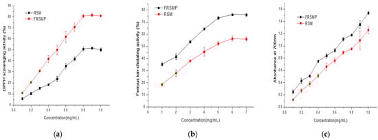 The reducing powers of the RSM and FRSMP are presented in Figure 7c. The absorbance values of the reducing power of the RSM and FRSMP depended on concentrations and were enhanced with the corresponding increases in the concentrations. When the absorbance value was 1, the concentrations of the rapeseed peptides from the RSM and FRSMP were 0.64 mg/mL and 0.85 mg/mL, respectively, which indicated that the FRSMP displayed a higher reducing power compared to the RSM.
