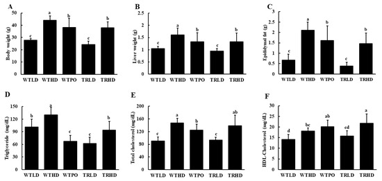 (A) Final body weight, (B) liver weight, (C) epididymal fat weight, (D) serum TG, (E) serum TC, and (F) HDL-C. Mice were divided into five groups (n = 8); WTLD and TRLD fed a low-fat diet (LD, 10% kcal from fat); WTHD and TRHD fed a high-fat diet (HD, 60% kcal from fat); WTPO fed an HD + PO diet (60% kcal from fat diet, supplemented with 8% perilla oil in the diet). Values are expressed as mean ± SD, and those with different superscript (a, b, c) letters indicate significance between groups by ANOVA with Duncan’s test at p < 0.05.