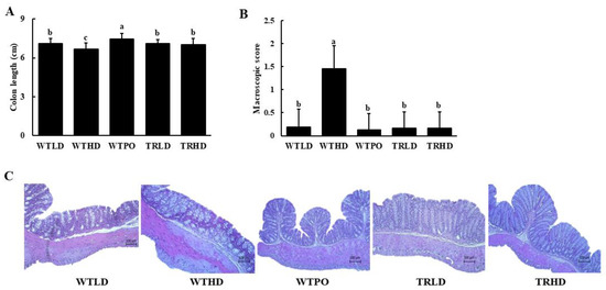 (A) Colon length, (B) macroscopic score, and (C) histological changes. Mice were divided into five groups (n = 8); WTLD and TRLD fed a low-fat diet (LD, 10% kcal from fat); WTHD and TRHD fed a high-fat diet (HD, 60% kcal from fat); WTPO fed an HD + PO diet (60% kcal from fat diet, supplemented with 8% perilla oil in the diet). Values are expressed as mean ± SD, and those with different superscript (a, b, c) letters indicate significance between groups by ANOVA with Duncan’s test at p < 0.05.