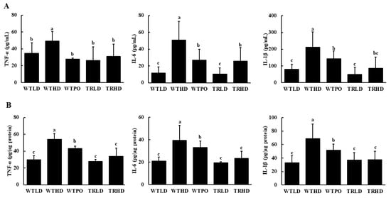 Pro-inflammatory cytokine levels in (A) serum and (B) colon. Mice were divided into five groups (n = 8); WTLD and TRLD fed a low-fat diet (LD, 10% kcal from fat); WTHD and TRHD fed a high-fat diet (HD, 60% kcal from fat); WTPO fed an HD + PO diet (60% kcal from fat diet, supplemented with 8% perilla oil in the diet). Values are expressed as mean ± SD, and those with different superscript (a, b, c) letters indicate significance between groups by ANOVA with Duncan’s test at p < 0.05.