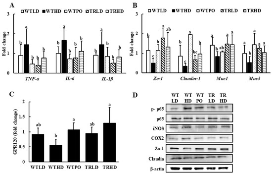 The mRNA expression of (A) pro-inflammatory markers, (B) epithelial tight junction markers, (C) GPR120, and (D) protein expression in colon. Mice were divided into five groups (n = 8); WTLD and TRLD fed a low-fat diet (LD, 10% kcal from fat); WTHD and TRHD fed a high-fat diet (HD, 60% kcal from fat); WTPO fed an HD + PO diet (60% kcal from fat diet, supplemented with 8% perilla oil in the diet). Values are expressed as mean ± SD, and those with different superscript (a, b, c) letters indicate significance between groups by ANOVA with Duncan’s test at p < 0.05.