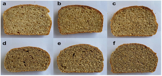 Images of the cross-section of bread slices: (a) control, (b) enriched bread with 10% cricket powder, (c) 15%, (d) 20%, (e) 25%, and (f) 30% by flour weight.