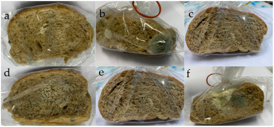 The mold growth on the cross-section of bread slices during shelf-life evaluation on the 5th day of storage at ambient temperature. (a) control, (b) enriched bread with 10% cricket powder, (c) 15%, (d) 20%, (e) 25%, and (f) 30% by flour weight.