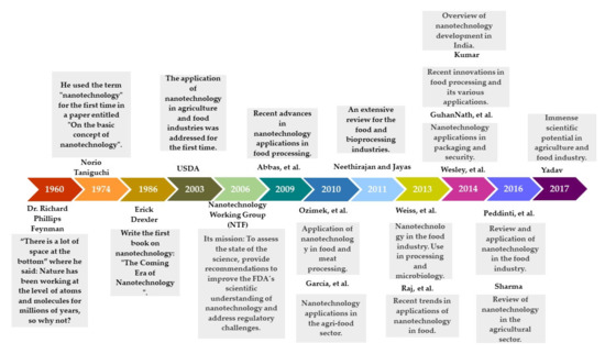 The potential use of nanotechnology in food industries has grown in association with increased interest in reducing the use of synthetic additives and other ingredients. But this is not a recent development. In fact, its history began in 1965 when Richard Feynman stated in his speech upon receiving the Novel Prize that “there was too much space at the bottom,” referring to all the possibilities that remained to be investigated. Norio Taniguchi coined the term “nanotechnology” just a few years later, in 1974. Figure 1 shows the evolution of nanotechnology with emphasis on food applications.