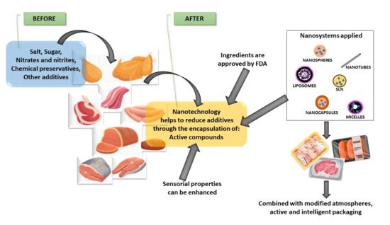 Nanosystems can play an important role in protecting functional ingredients from chemical or biological degradation (e.g., oxidation) during processing, storage, and use, and can control the release of active agents or the conditions that trigger their release (e.g., pH, ionic strength, storage and processing temperatures) [66,90]. For example, in the industrial production of sausages and cured meats, numerous additives are required to accelerate processes and for new formulations that minimize or modify fat content and reduce sodium, phosphate, and nitrate content. New formulations may incorporate probiotics, prebiotics, other materials, such as algae and nuts [39], or encapsulated active ingredients such as vitamins C and E and fatty acids that can be used as preservatives and processing aids. These advances can be achieved using nanotechnology, always keeping in mind that they must be compatible with such attributes as the flavor, texture, and color of the final products [91].