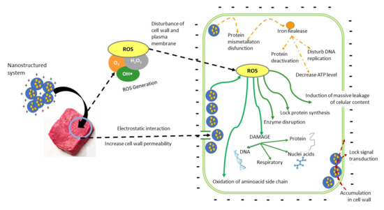 Action mechanism of nanostructured systems as antimicrobial agents applied to meat.