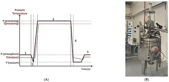(A) Schematic of the time-temperature-pressure profile of a DIC processing cycle. (1) Establishment of the vacuum within the processing reactor; (2) injection of steam at the selected pressure; (3) maintenance of treatment pressure during selected time; (4) instant controlled pressure drop towards vacuum; and (5) establishment of the atmospheric pressure within the processing reactor. (B) Laboratory DIC reactor (LABIC0.1, ABCAR-DIC Process; La Rochelle, France).