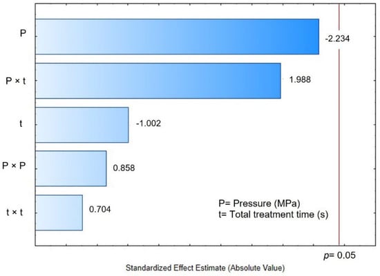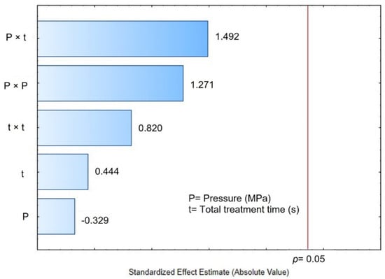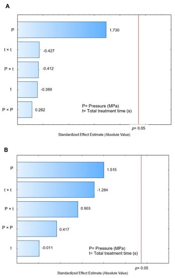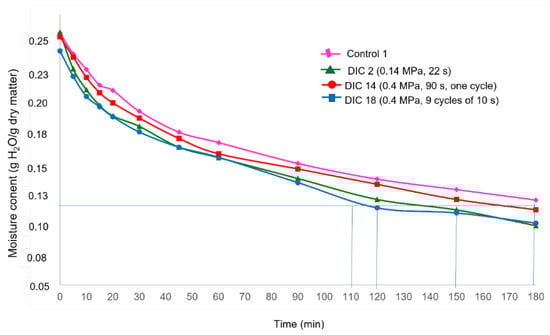 Finally, by comparing the final moisture content after 2 h of rehydration (Wt = 120 min) of the control (0.442 g H2O/g dry matter) vs. DIC-CAD samples (0.3917 to 0.7530 g H2O/g dry matter), it can be observed that under DIC treatments of 0.4 MPa and nine cycles of 10 s it could be possible to increase significantly the final moisture content (1.7 times for DIC 17 vs. control). However, regarding the Pareto chart (Figure 8B), the Wt = 120 min cannot be accurately explained by steam pressure and treatment time under the selected ranges.