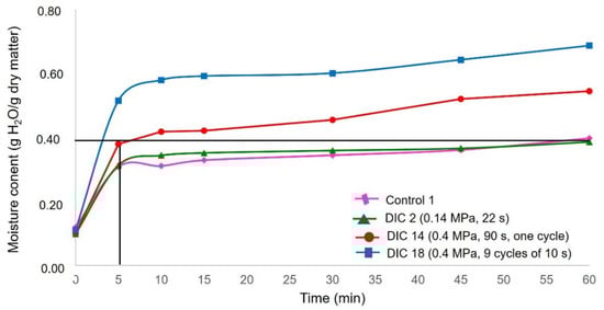 On the other hand, by comparing both the controls and the DIC treatments, it can be observed that under 0.4 MPa and nine cycles of 10 s, it was possible to achieve in only 5 min the same moisture content of controls after 2 h of rehydration (0.4421 g H2O/g dry matter). Moreover, to obtain an average final moisture content of 0.7121 g H2O/g dry matter, DIC 17 and DIC 18 required 2 h instead of 17 h for controls. Similar results were found by Martínez-Garza [] for blue, yellow, and white non-treated maize kernels which required 15 h of rehydration to achieve equilibrium moisture contents of 0.5270, 0.5000, and 0.5040 g H2O/g dry matter, respectively. This result reflects that DIC treatment intensified both rehydration stages, the starting accessibility and diffusional stages. Moreover, it has been stated that in this study rehydration kinetics were carried out at 20 °C, then, it can be suggested to study the rehydration kinetics of DIC-CAD samples under at least three different temperatures (i.e., 25, 35, and 45 °C) and on different varieties of maize kernels.