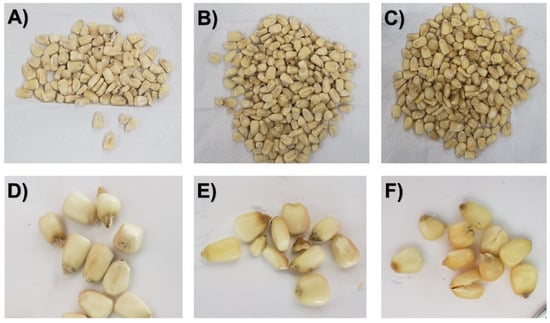 Dried and rehydrated maize kernels: (A) Dried control, (B) Dried DIC 14 (P = 0.4 MPa, t = 90 s), (C) Dried DIC 18 (P = 0.4 MPa, t = 90 s divided into nine cycles of 10 s), (D) Rehydrated Control, (E) Rehydrated DIC 14, and (F) Rehydrated DIC 18.