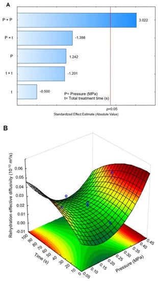Concerning the effective diffusivity during rehydration (Deff_rehy), controls presented an average measure of 0.0146 × 10−10 m²/s, and DIC-CAD samples presented values between 0.0030 and 0.0385 × 10−10 m²/s. The lowest Deff_rehy was obtained under DIC 7 (0.25 MPa and 50 s) and the highest values under DIC 13 (0.4 MPa and 50 s). Figure 7A shows that under the selected operating parameters (P and t), the saturated steam pressure square significantly affected the Deff_rehy response. Additionally, the response surface graph (Figure 7B) shows that the Deff_rehy could be increased under steam pressure above 0.40 MPa and a treatment time of some seconds. Figure 7B also displays the fitting model for this response.