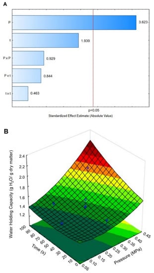 Effects of Pressure (MPa) and time (s) of DIC treatment on the water holding capacity (WHC) of maize kernels. (A) Pareto Chart and (B) surface response and fitting model. WHC = 1.146 − 1.114P + 3.306P2 − 0.0034t + 0.000023t2 + 0.0147P × t.
