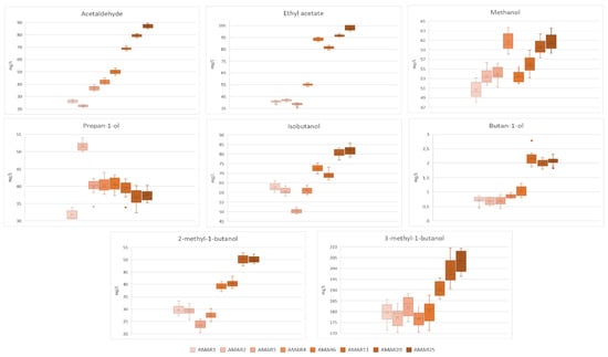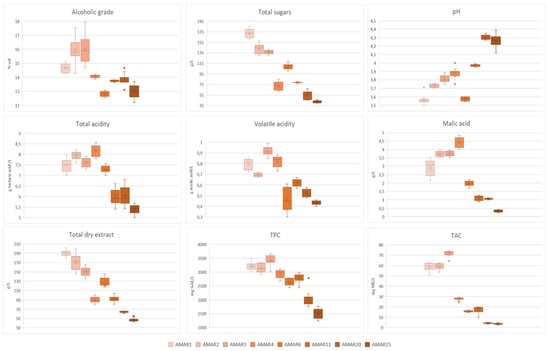 The physicochemical data from the various Amarena wines are illustrated in Figure 1 by means of Box and Whisker charts and listed in Table S1.
