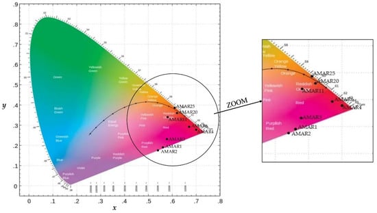 The chromaticity of the different Amarena wines is illustrated in Figure 2. In Table S2, the coordinates of luminosity (Y), hue (x) and purity (y) responsible for the chromaticity of every sample are also listed.