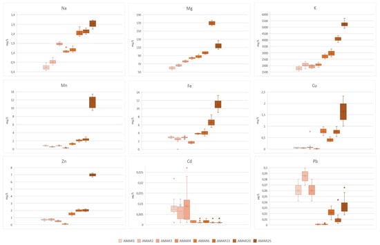 However, potentially toxic trace elements, such as Cd and Pb, had an opposite evolution during the wine aging. Specifically, Cd evolved steadily in wines aged for 25 and 4 years (i.e., AMAR25-AMAR4: 1.17–1.27 µg/L, p > 0.05), and then it sharply increased in younger wines (i.e., AMAR3-AMAR1: 8.88–8.43 µg/L, p > 0.05). Pb was found at quite high levels in the older Amarena bottles (i.e., AMAR25-AMAR11: 34.3–22.27 µg/L, p > 0.05), then it significantly reduced in wines with intermediate aging periods (i.e., AMAR6-AMAR4: 1.65–1.25 µg/L, p > 0.05) and, finally, it markedly increased in younger Amarena bottles (i.e., AMAR3-AMAR1: 57.65–60.07 µg/L, p > 0.05). The relevant contents of Pb and Cd in older Amarena samples may reflect the progressive deterioration of the surrounding environment in terms of anthropogenic pollution.