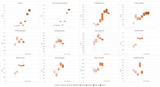 Box and Whisker charts illustrating the levels of furanic compounds and ethyl esters of Amarena wines in relation to different bottle aging. In each graph, data were expressed as mean ± standard deviation of n = 15 samples coming from 5 bottles, where every sample was analyzed three times. The “×” indicates the average value in each wine group; whereas the outlier points display the outlier data that lie either below the lower whisker line or above the upper whisker line.