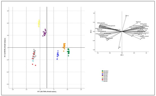 In particular, an acetic acid content exceeding 0.7 g/L would give a sour and pungent aroma to the younger beverages [], while concentrations between 0.2 and 0.7 g/L would contribute to the complexity of the aroma of older wines []. Accordingly, malic acid increased during the first 4 years of wine aging (i.e., AMAR1-AMAR4: from 2.91 g/L to 4.43 g/L, p < 0.05) and steadily reduced up to 25 years of aging (i.e., AMAR6-AMAR25: from 1.98 g/L to 0.34 g/L, p < 0.05) (Figure 1 and Table S1). This could be due to the malolactic fermentation typically occurring during wine aging. Indeed, the malic acid already present in the wine before the bottling phase does not precipitate like tartaric acid and can initiate a second round of fermentation, by transforming itself into the more delicate and less pungent lactic acid, thus, reducing wine acidity [,,,]. As expected, the overall reduction of wine acidity corresponded to an increase of the pH wine, as younger Amarena wines generally exhibited lower pH values than the older counterpart (e.g., AMAR1-AMAR4: 3.55–3.88, p < 0.05 vs. AMAR20-AMAR25: 4.30–4.26, p < 0.05) (Figure 1 and Table S1).