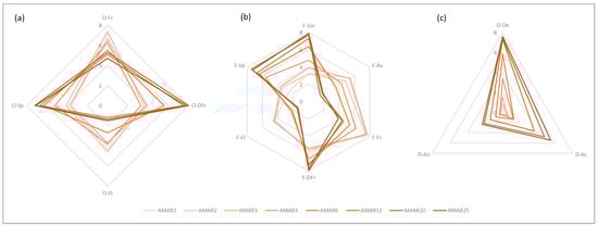 A descriptive sensory analysis of the several Amarena wines was conducted according to the standards of the ISO 13299:2016 []. A seven member panel (four females and three males between 30 and 60 years old) constituted by technicians, researchers, and professors from the University of Messina with a solid experience in the food and beverage area, including the sensorial analysis of wine, was trained following the criteria of ISO 8586:2012 [] and the sensory analysis was conducted in a tasting room designed according to the ISO 8589:2007 standard []. Specifically, the room had controlled conditions of temperature, humidity, and light and contained 10 tasting booths, each surrounded by walls and ceiling white in color and fitted with a light producing natural day light, a white sink and a frontal white desk allocating the wines to be tested.