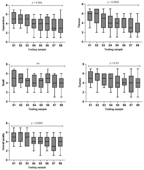 Sensory aspects of texture-modified meal testing samples using a 7-point scale. 1 = extremely poor, 4 = average, 7 = excellent. S1 = freshly made Soft & Bite-Sized sample, S2 = sous-vide Soft & Bite-Sized sample, S3 = freshly made Minced & Moist sample, S4 = hydrolysed Minced & Moist sample, S5 = commercially packaged Minced & Moist sample, S6 = freshly made pureed sample, S7 = hydrolysed pureed sample and S8 = commercially packaged pureed sample. Kruskal-Wallis test was performed. ns = no significance. p < 0.05 indicates significance.
