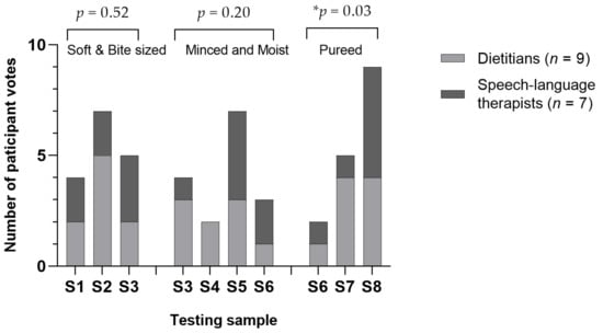 There were no significant differences between dietitians and speech-language therapists in selecting the samples most appropriate to each level of TMFs (Soft & Bite-Sized p = 0.53, Minced & Moist p = 0.35 and pureed p = 0.43). Overall, commercially packaged pureed samples received significantly more votes than other pureed samples (Figure 2).
