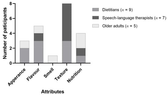 As shown in Figure 3, 71% (n = 15) of the participants chose texture as the top attribute, followed by flavour (67%, n = 14) and nutrition (62%, n = 13). Dietitians and speech-language therapists had varying perspectives on an ideal TMF. Dietitians focused on patient intake, which is associated with the palatability and nutrition content of TMFs, whilst speech-language therapists placed a higher priority on texture and consistency, which in turn affects patient safety. A higher protein level and meat component were attractive to all stakeholders.