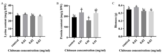 Effects of chitosan on (A) lysine, (B) protein and (C) biomass of F. filiformis mycelium. All calculated results are expressed as mean ± standard deviation, and different English letters indicate significant differences among different treatments (p < 0.05).