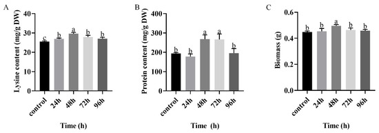 Effects of chitosan treatment of different durations on (A) lysine, (B) protein and (C) biomass of F. filiformis mycelium. All the calculated results are expressed in the form of mean ± standard deviation, while different English letters indicate significant differences among different treatments (p < 0.05).