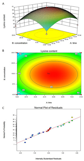 In this equation, Y is the dependent variable representing lysine content; Time and Concentration are the time and concentration, respectively, of chitosan treatment. The results show that the F value of the model is 12.47, and the p-value (Prob > F) value is less than 0.0001, which means that the model is significant. The correlation coefficient R2 is greater than 0.8, and the coefficient of variation is 3.72%, which indicates that there is a good degree of fit between the actual value of the lysine content and the predicted value obtained by the software.