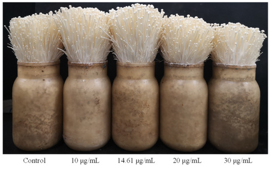 F. filiformis was inoculated aseptically and cultured in the factory for about 55 days. Sterile water was used in the control group, and 10 μg/mL, 14.61 μg/mL, 20 μg/mL and 30 μg/mL of chitosan were added for spraying treatment at the stage during which they needed to be watered during cultivation. The growth status of F. filiformis fruiting body that was treated with chitosan is shown in Figure 4. Compared with the control group, the growth rate of fruiting body of F. filiformis treated with 14.61 μg/mL chitosan increased by 23.35% (Table 4). The growth rate of F. filiformis was the fastest at this concentration. The results show that lysine content and the growth rate of fruiting body of F. filiformis could be increased by adding 14.61 μg/mL chitosan optimized by RSM. It was proven that optimization of the induction conditions of chitosan by RSM is very reliable. Therefore, chitosan can be added in the cultivation and production of F. filiformis.