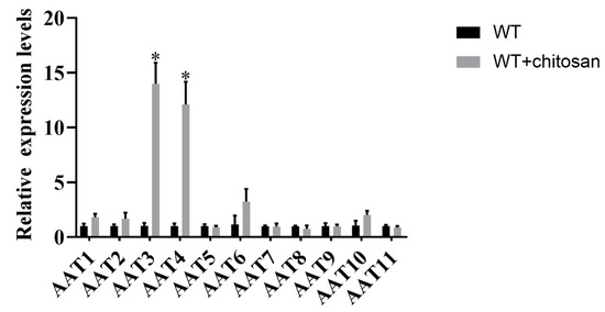 Gene screening of amino acid transporters treated with chitosan. The transcriptional levels of each AAT gene in WT strain were detected after chitosan treatment. The results are presented as mean ± standard deviation, and the asterisk indicates that there was a significant difference between the experimental group and the control group, * p < 0.01.