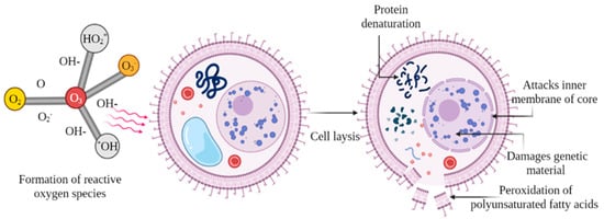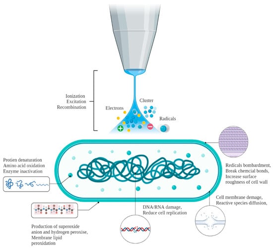 CP is among the emerging decontamination technologies that preserve food at ambient or sublethal temperatures and is being extensively explored for application in raw and processed meat products. CP is produced by exposing gas (air or any gas mixture) between electrodes to generate a very high strength of an electric field by using dielectric barrier discharge (DBD), radio frequency, and microwave power sources. The ionized gases consist of chemically reactive species, such as positive and negative ions, radicals, electrons, excited and neutral molecules, ultraviolet photons, and visible light [71]. Chemical bonds are split by these antimicrobial active species, with charged particles present in the biomaterials, which initiate various biochemical reactions leading to the death of microorganisms. In particular, reactive nitrogen species (RNS) and reactive oxygen species (ROS), along with hydroxyl radicals, ozone, singlet oxygen, hydrogen peroxide, superoxide anion, hydroperoxyl, nitrogen dioxide radical, nitric oxide, peroxyl, alkoxyl, alkylperoxynitrite, peroxynitrous acid, and peroxynitrite are active antimicrobial agents that injure or kill microbes during direct contact via reacting with various macromolecules present in the bacterial cells [72]. Figure 2 shows a schematic representation of the cold plasma sterilization of bacterial cells.