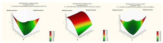 All of the values of the color parameters in the berry pomace differed significantly (Figure 1). The raspberry pomace was brighter and L* value was 2.18 NBS units higher than blackberry. The main pomace color difference was observed in the a* and b* coordinates values. The raspberry pomace was redder than the blackberry, respectively, the a* values were 32.67 and 10.24 and the blackberry pomace was bluer than the raspberry, respectively, the b* values were 12.93 and 21.52 NBS units (Figure 1a–c).