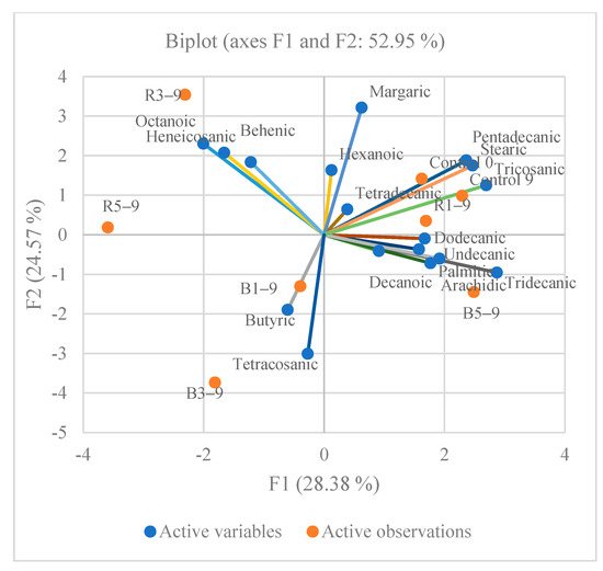Principal component analysis (PCA) for saturated fatty acids of meat patties with different berries pomace additive stored for nine days (Control 0—meat patties without additives before storage; Control 9—without additives stored for 9 days); R1–9 and B1–9—with 1% of raspberry and blackberry pomace additives after 9 days of storage; R3–9 and B3–9—with 3% of raspberry and blackberry pomace additives after 9 days of storage; R5–9 and B5–9—with 5% of raspberry and blackberry pomace additives after 9 days of storage).