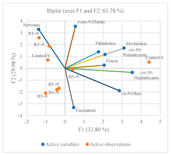 Figure 4 shows that the first factor (PC1) was highly and positively correlated with palmitoleic, erucic, myristoleic, cis-10-heptadecanic, and cis-10-pentadecenic fatty acids, and the highest contents were in the control beef patties before the storage. The second factor (PC2) is highly and positively related to nervonic fatty acid and the control beef patties after the storage, as well as with raspberry pomace, while negatively with eicosanoid fatty acid and the patties with the blackberry pomace. Monounsaturated fatty acids were predominant in the beef meat, with cis-9-oleic being the most abundant fatty acid in all of the meat samples. The trans-9-elaidic fatty acid content decreased in the meat patties after the storage and the main decrease was observed in the patties with the blackberry addition, compared with the control beef patties, by 1.26 times.