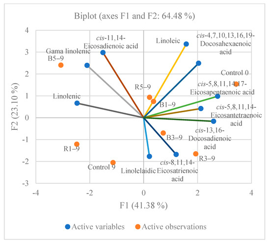Principal component analysis (PCA) for polyunsaturated fatty acids of meat patties with different berries pomace additives stored for nine days (Control 0—meat patties without additives before storage; Control 9—without additives stored for 9 days); R1–9 and B1–9—with 1% of raspberry and blackberry pomace additives after 9 days of storage; R3–9 and B3–9—with 3% of raspberry and blackberry pomace additives after 9 days of storage; R5–9 and B5–9—with 5% of raspberry and blackberry pomace additives after 9 days of storage).