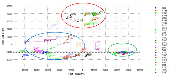 Principal component analysis (PCA) for volatile compounds of meat patties with different berries pomace additives stored for nine days (CBS—meat patties without additives before storage; C3D, C6D, C9D—without additives stored for 3, 6, 9 days; R1BS, B1BS, R3BS, B3BS, R5BS, B5BS—meat patties with 1, 3 and 5% of pomace additives before storage; R13D, B13D, R16D, B16D, R19D, B19D—with 1% of raspberry and blackberry pomace additives after 3, 6, 9 days of storage; R33D, B33D, R36D, B36D, R39D, B39D—with 3% of raspberry and blackberry pomace additives after 3, 6, 9 days of storage; R53D, B53D, R56D, B56D, R59D, B59D—with 5% of raspberry and blackberry pomace additives after 3, 6, 9 days of storage).