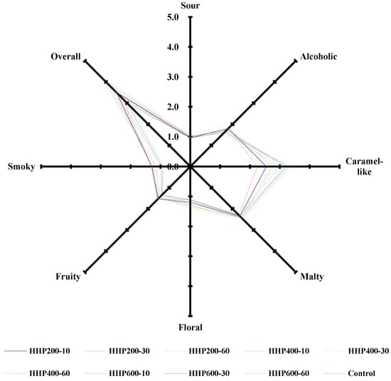 Sensory analysis is the most direct method used to evaluate the quality of soy sauce. We conducted a QDA of soy sauce to explore the effects of HHP treatment on its sensory characteristics. As shown in Figure 1, overall, the aroma scores of sour, caramel-like, malty and floral in soy sauces treated using HHP increased by 1.05–7.37%, 13.33–48.89%, 0.43–8.70% and 0.91–27.27% respectively, while the alcoholic, fruity and smoky aromas decreased by 0.56–11.11%, 1.29–12.90% and 0.77–32.31%, respectively, compared to the control. In terms of overall sensory evaluation scores, the overall scores of the 200 MPa treatment group and the 400 MPa treatment group were 9.37–14.38% and 21.25–32.81% higher than that of the control, respectively. In the 600 MPa treatment group, only HHP600–10 increased by 10.94% compared with the control, while the scores of HHP600–30 and HHP600–60 decreased by 4.69% and 9.38%, respectively. Among the sensory scores of sour, caramel-like, malty and floral, those of HHP400–30 increased by 7.37%, 46.67%, 8.70% and 27.27%, respectively, while the alcoholic, fruity and smoky aromas decreased by 5.56%, 6.45% and 11.54%, respectively, compared to the control. HHP400–30 obtained the highest overall sensory evaluation score of 4.25, which was higher than that of soy sauce fermented for 180 d []. These results indicated that proper HHP treatment could simultaneously accelerate maturation of soy sauce aroma and improve its aroma quality.
