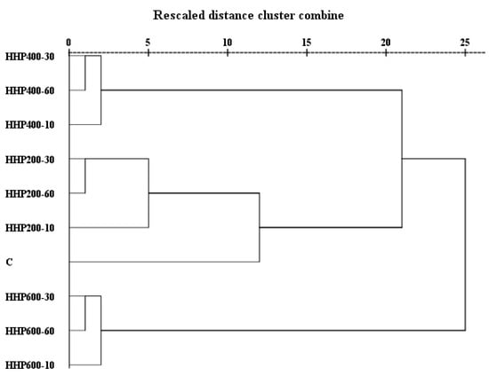 HCA is performed to visually and objectively elucidate the aroma similarity among the samples and control. HCA is performed according to changes in OAVs. As shown in Figure 2, HHP200–10, HHP200–30 and HHP200–60; HHP400–10, HHP400–30 and HHP400–60; and HHP600–10, HHP600–30 and HHP600–60 were firstly grouped into three sets in parallel; the control was a separate group. The earlier the samples were grouped into one cluster, the more similar aromas they had. These results revealed that the effect of treatment pressure on flavor was greater than that of treatment time. Secondly, the control and groups of HHP200–10, HHP200–30 and HHP200–60 were merged into one bigger group (C, HHP200–10, HHP200–30 and HHP200–60), while the 400 MPa and 600 MPa treatment groups remained as two separate groups. This indicated that the aroma of soy sauce treated with 200 MPa was closer to that of the control. Lastly, the group of HHP400–10, HHP400–30 and HHP400–60 and group of C, HHP200–10, HHP200–30 and HHP200–60 were combined into one larger group, while the 600 MPa treatment group remained as a separate group. As demonstrated in Figure 1, the total scores of HHP400–10, HHP400–30 and HHP400–60 were all higher than that of the control, and HHP400–30 received the highest score. The objectivity of the sensory evaluation was substantiated by HCA results. Thus, it could be concluded that appropriate HHP treatment could be used to accelerate aroma formation and significantly improve aroma quality in comparison to the control, but using excessively high pressure could have adverse effects on the aroma of soy sauce.