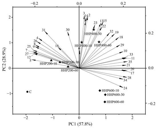PCA was used to further determine the directional alterations of the main aroma-active compounds under different treatment conditions. In this study, 35 OAVs of main aroma-active compounds were used as variables for PCA. The principal component biplot is shown in Figure 3, where two main PCs accounted for 86.7% of the variability. The first principal component (PC1) and the second principal component (PC2) were responsible for 57.8% and 28.9% of the total difference, respectively. The PC1 and PC2 divided soy sauce samples and the control into four different groups. The untreated soy sauce was on the negative side of the PC1 and the PC2; those treated at 200 MPa were on the positive side of the PC2 and negative side of the PC1; those treated at 400 MPa were on the positive side of the PC1 and the PC2; and those treated at 600 MPa were on the positive side of the PC1 and negative side of the PC2. We also found that the processing pressures and processing times of soy sauce were positively correlated with the PC1 except for the HHP600–60 group.