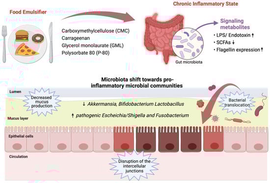 Dietary emulsifier exposure can shift the gut microbiota, inducing a proinflammatory signaling, predisposing the body to several diseases. Using a human microbiota in vitro model—the MiniBioReactor Arrays (MBRA)—Naimi S et al. [] evaluated the impact of 20 dietary emulsifiers on the microbiota. The study showed how the administration of commercially available emulsifiers alters microbiota composition and gene expression, predisposing the body to a chronic inflammatory state. In particular, the administration of polysorbate 80, carrageenan, and agar agar could reduce the relative abundance of Clostridiales order (especially Faecalibacterium genus) and Verrucomicrobiales, driven by the Akkermansia genus well-known for its anti-inflammatory properties. Moreover, xantham gum, sorbitan monostearate, glyceryl stearate, and carrageenan administration in vivo increase bioactive lipopolysaccharide (LPS) levels and encourage flagellin expression []. Maltodextrin, which has emulsifying properties, has a direct effect on gut microbiota, enhancing cell adhesion and biofilm formation through the stimulation of multiple E. coli strains [].