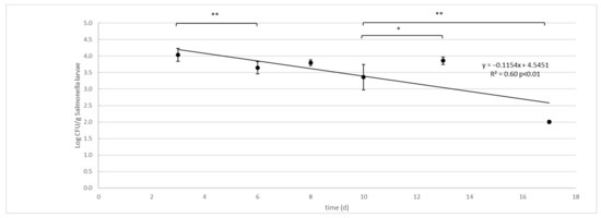 Salmonella enterica Typhimurium decay in larvae (Log CFU/g) of black soldier fly (H. illucens) reared on artificial contaminated substrate. Vertical bars represent standard deviation of 6 rep. in two independent challenge tests. Horizontal bars show significant differences among experimental points, * p < 0.05; ** p < 0.01. The equations for the regression line and R2 are presented together with the p significant of the model.