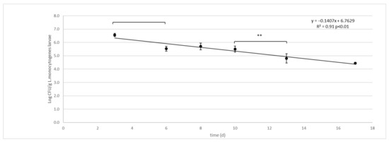 L. monocytogenes decay in larvae (Log CFU/g) of black soldier fly (H. illucens) reared on artificial contaminated substrate. Vertical bars represent the standard deviation of 6 rep. in two independent challenge tests. Horizontal bars show significant differences among experimental points, ** p < 0.01. The Equation for the regression line and R2 are presented together with the p significant of the model.