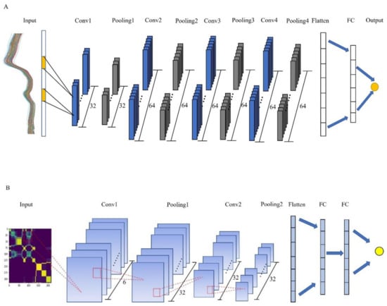 The designed structure of convolutional neural network models. (A) 1D-CNN; (B) 2D-MTF-CNN.