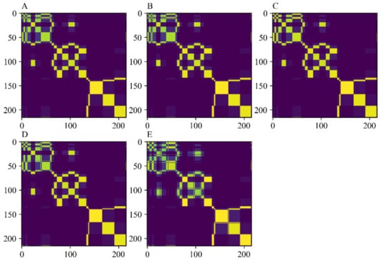 The images of Markov transition field with different noise levels. (A) No noise added; (B) Add a noise level of 80 dB; (C) Add a noise level of 70 dB; (D) Add a noise level of 60 dB; (E) Add a noise level of 50 dB.