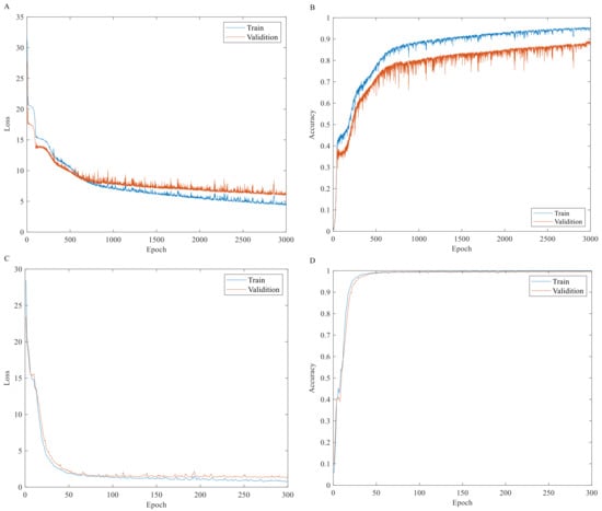 The training results of the convolutional neural network. (A) Loss of 1D-CNN; (B) Accuracy of 1D-CNN; (C) Loss of 2D-MTF-CNN; (D) Accuracy of 2D-MTF-CNN.